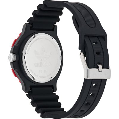 This Adidas watch has a case made of Resin with a diameter of 40 mm and is fitted with a rubber band. Inside the case lies a Timex movement and the watch features a Mineral crystal.