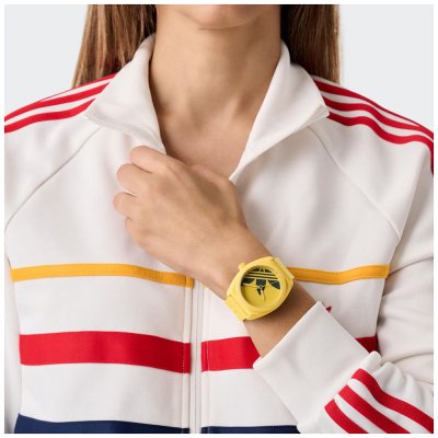 This Adidas watch has a case made of BioCeramic with a diameter of 44 mm and is fitted with a Bio-sourced resin band. Inside the case lies a Timex movement and the watch features a Mineral crystal.