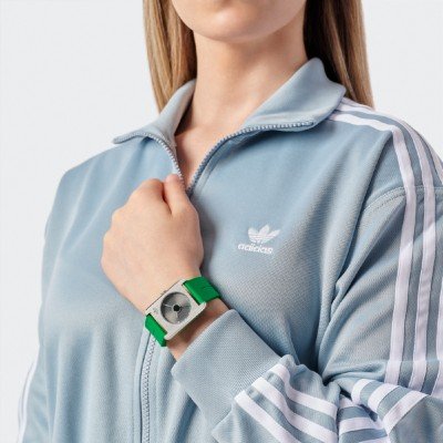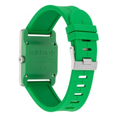 This Adidas watch has a case made of stainless steel with a diameter of 31 mm and is fitted with a rubber band. Inside the case lies a Timex movement and the watch features a Mineral crystal.
