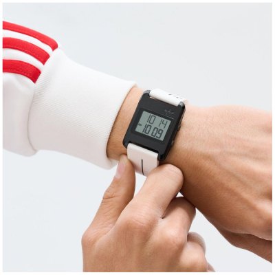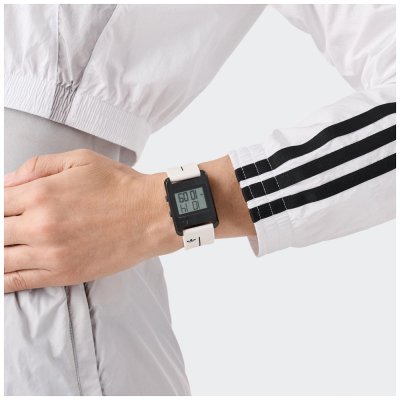 This Adidas watch has a case made of stainless steel with a diameter of 31 mm and is fitted with a rubber band. Inside the case lies a Timex movement and the watch features a Mineral crystal.