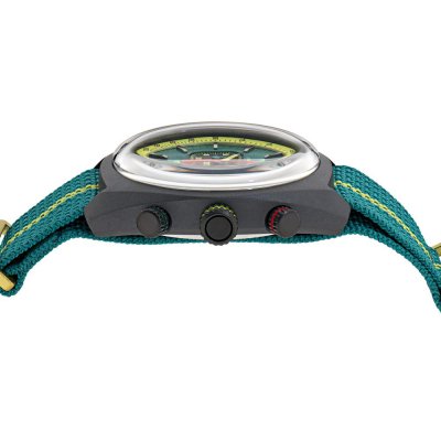 This Aston Martin watch has a case made of Resin with a diameter of 43 mm and is fitted with a Nylon band. Inside the case lies a Timex movement and the watch features a Acrylic crystal.