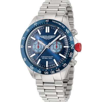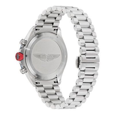 This Aston Martin watch has a case made of stainless steel with a diameter of 44 mm and is fitted with a stainless steel band. Inside the case lies a Timex movement and the watch features a Mineral crystal.