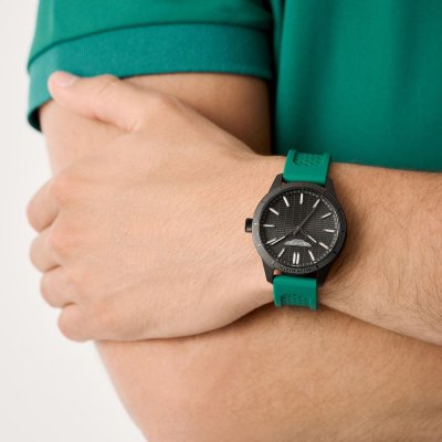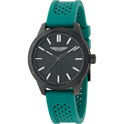 This Aston Martin watch has a case made of stainless steel with a diameter of 38 mm and is fitted with a rubber band. Inside the case lies a Timex movement and the watch features a Mineral crystal.