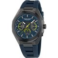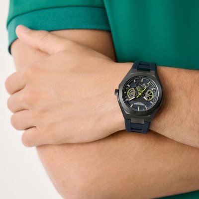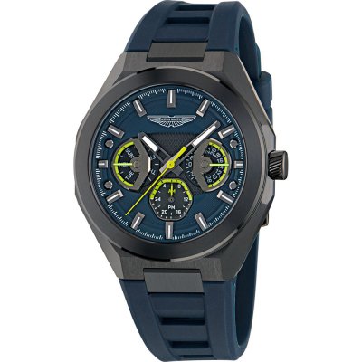 This Aston Martin watch has a case made of stainless steel with a diameter of 42 mm and is fitted with a rubber band. Inside the case lies a Timex movement and the watch features a Mineral crystal.