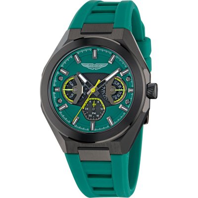 This Aston Martin watch has a case made of stainless steel with a diameter of 42 mm and is fitted with a rubber band. Inside the case lies a Timex movement and the watch features a Mineral crystal.