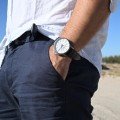 This Bauhaus watch has a case made of titanium with a diameter of 42 mm and is fitted with a leather band. Inside the case lies a Miyota movement and the watch features a Sapphire crystal.
