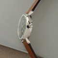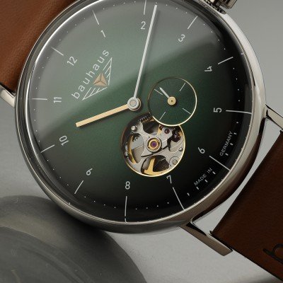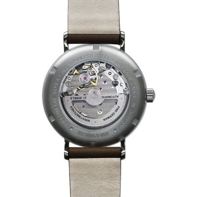 This Bauhaus watch has a case made of stainless steel with a diameter of 41 mm and is fitted with a leather band. Inside the case lies a Miyota movement and the watch features a K1 Mineral crystal.