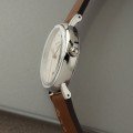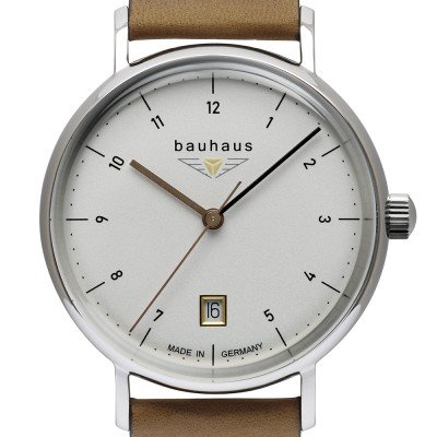 This Bauhaus watch has a case made of stainless steel with a diameter of 36 mm and is fitted with a leather band. Inside the case lies a Ronda movement and the watch features a K1 Mineral crystal.