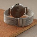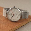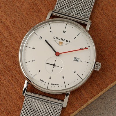 This Bauhaus watch has a case made of stainless steel with a diameter of 41 mm and is fitted with a stainless steel band. Inside the case lies a Ronda movement and the watch features a K1 Mineral crystal.