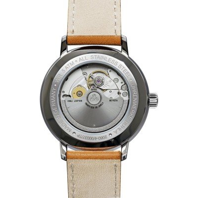 This Bauhaus watch has a case made of stainless steel with a diameter of 41 mm and is fitted with a leather band. Inside the case lies a Miyota movement and the watch features a K1 Mineral crystal.