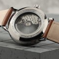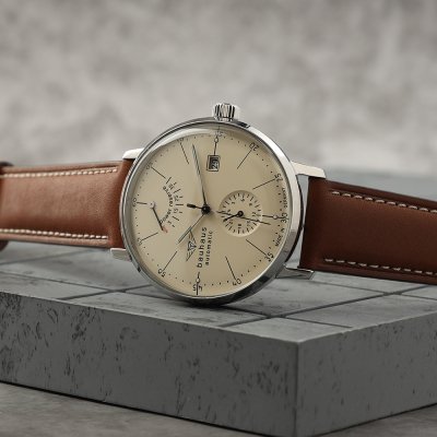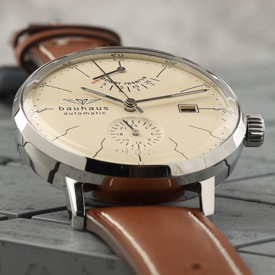 This Bauhaus watch has a case made of stainless steel with a diameter of 41 mm and is fitted with a leather band. Inside the case lies a Miyota movement and the watch features a K1 Mineral crystal.