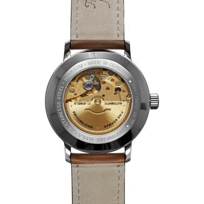 This Bauhaus watch has a case made of stainless steel with a diameter of 41 mm and is fitted with a leather band. Inside the case lies a Miyota movement and the watch features a K1 Mineral crystal.