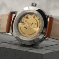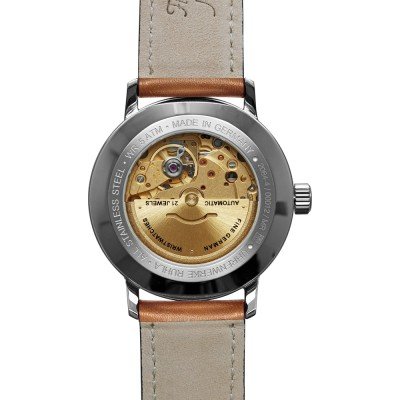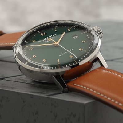 This Bauhaus watch has a case made of stainless steel with a diameter of 41 mm and is fitted with a leather band. Inside the case lies a Miyota movement and the watch features a K1 Mineral crystal.