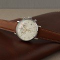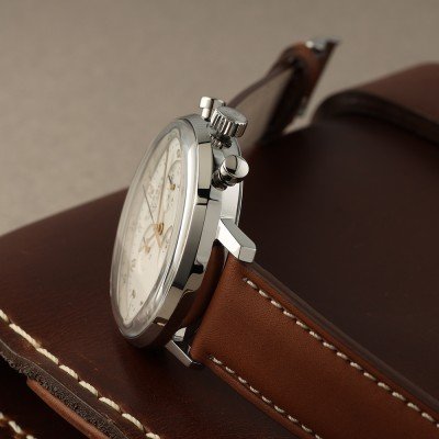 This Bauhaus watch has a case made of stainless steel with a diameter of 41 mm and is fitted with a leather band. Inside the case lies a ETA movement and the watch features a K1 Mineral crystal.