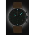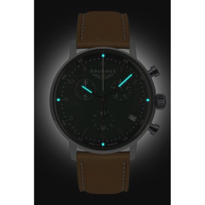 This Bauhaus watch has a case made of stainless steel with a diameter of 41 mm and is fitted with a leather band. Inside the case lies a ETA movement and the watch features a K1 Mineral crystal.