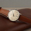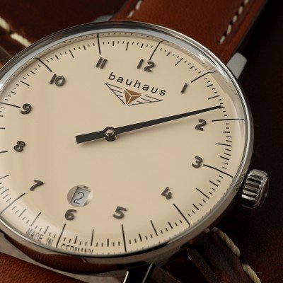 This Bauhaus watch has a case made of stainless steel with a diameter of 40 mm and is fitted with a leather band. Inside the case lies a ETA movement and the watch features a K1 Mineral crystal.
