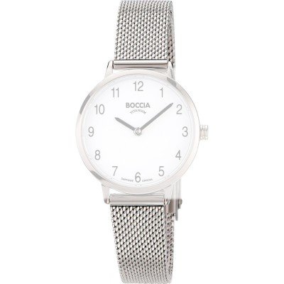 This Boccia watch strap is made of stainless steel and is attached to the watch by means of pushpins. The band has a width of 12 mm and is closed by means of a milanese clasp. The strap has a straight mount which means that this strap is suitable for all Boccia watches with a straight mount.