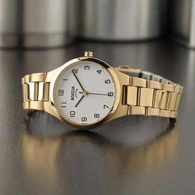 This Boccia watch has a case made of titanium with a diameter of 30 mm and is fitted with a titanium band. Inside the case lies a Miyota movement and the watch features a Mineral crystal.