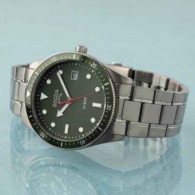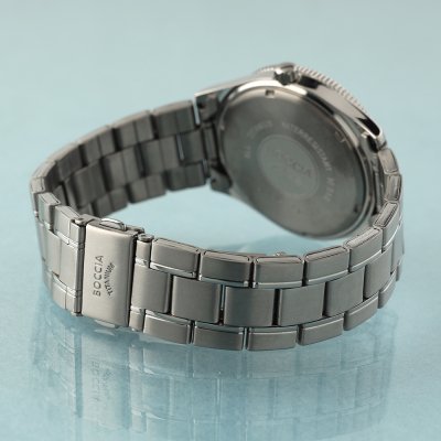 This Boccia watch has a case made of titanium with a diameter of 39 mm and is fitted with a titanium band. Inside the case lies a Miyota movement and the watch features a Mineral crystal.