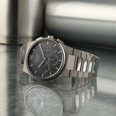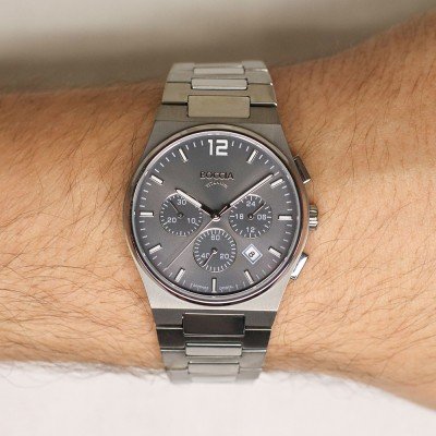 This Boccia watch has a case made of titanium with a diameter of 39 mm and is fitted with a titanium band. Inside the case lies a Miyota movement and the watch features a Sapphire crystal.