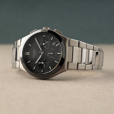 This Boccia watch has a case made of titanium with a diameter of 39 mm and is fitted with a titanium band. Inside the case lies a Miyota movement and the watch features a Sapphire crystal.