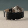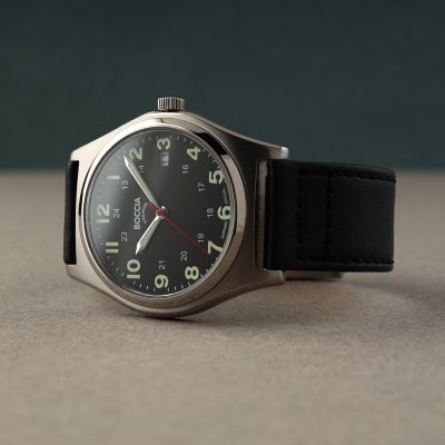 This Boccia watch has a case made of titanium with a diameter of 39 mm and is fitted with a leather band. Inside the case lies a Miyota movement and the watch features a Sapphire crystal.