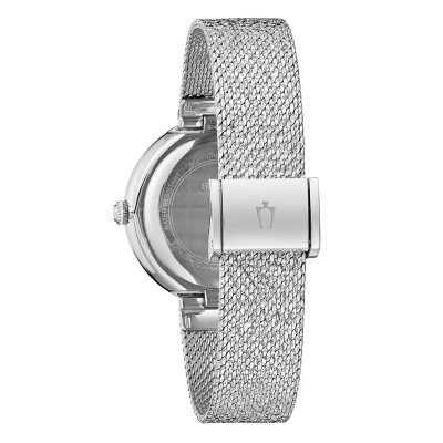 This Bulova watch has a case made of stainless steel with a diameter of 32 mm and is fitted with a stainless steel band. Inside the case lies a Miyota movement and the watch features a Sapphire crystal.