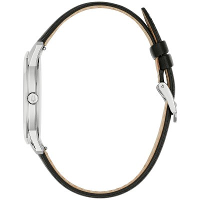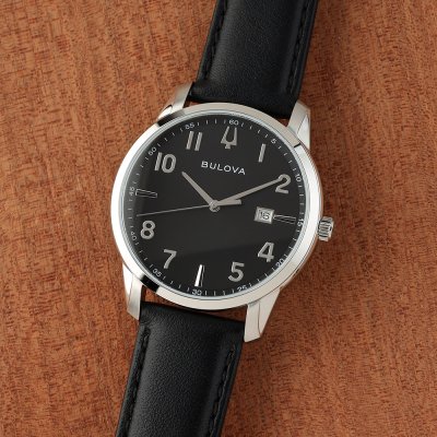 This Bulova watch has a case made of stainless steel with a diameter of 40 mm and is fitted with a leather band. Inside the case lies a Miyota movement and the watch features a Mineral crystal.