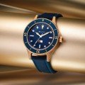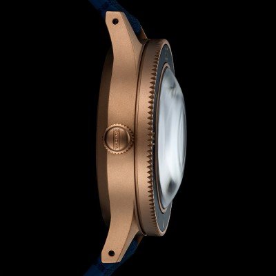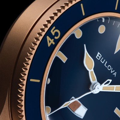This Special Edition MIL-SHIPS diving watch is based on a prototype developed in collaboration with developed by the US Navy in 1957. The watch celebrates the 150-year anniversary of Bulova. The watch has a sandblasted CuSn8-Bronze case, the color of a 19th century diving helmet. A very strong material which will develop a natural patina over time. The intense blue dial matches the bi-directional aluminium bezel for a vintage-inspired look. Applied with super bright markings, a two-tone moisture indicator and a sapphire crystal with a 5-layer anti-reflex protection. The bracelet is made of a special molding made of rubber and cordura® nylon for durability and comfort. The case back is engraved celebrating Bulova’s 150 year anniversary.