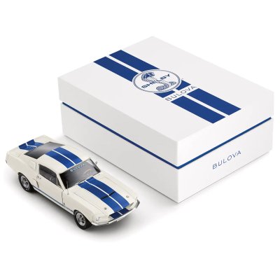 This exciting Limited Edition Citizen Bull’s head chronograph was developed in collaboration with muscle car customiser Carroll Shelby to celebrate the brand’s 150th Anniversary. The watch’s main colors are derived from Shelby’s signature blue and white, accenting the dial and rubber strap. The angular bullhead case is inspired by the power of the 1967 Shelby Ford Mustang GT500 and its aerodynamic lines. And finally, the Shelby logo is present in the 3 o’clock sub-dial. The watch features a chronograph functionality, timing to an astonishing 1/1000 second, powered by Bulova’s proprietary high precision quartz Precisionist movement. Each of the 7500 Citizen Shelby chronographs is individually numbered and features a case back bearing Shelby’s signature. The watch comes in a limited-edition box with a 1:24 die-cast model of the GT500.