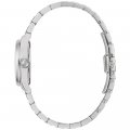This Bulova watch has a case made of stainless steel with a diameter of 29 mm and is fitted with a stainless steel band. Inside the case lies a Miyota movement and the watch features a Mineral crystal.