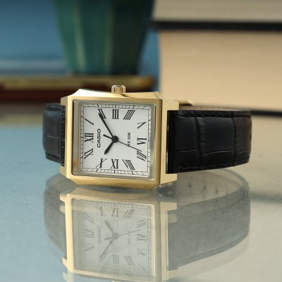 This Casio watch has a case made of stainless steel with a diameter of 32 mm and is fitted with a leather band. Inside the case lies a Casio movement and the watch features a Mineral crystal.
