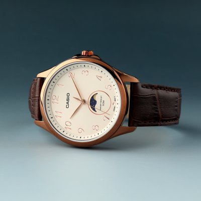 This Casio watch has a case made of stainless steel with a diameter of 42.5 mm and is fitted with a leather band. Inside the case lies a Casio movement and the watch features a Mineral crystal.