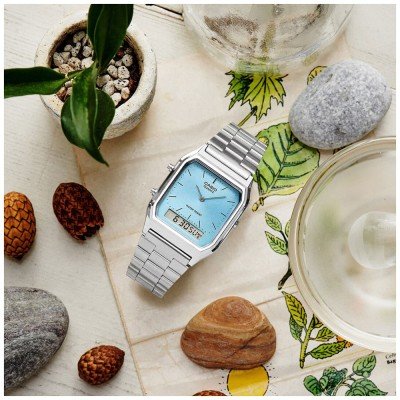 This Casio watch has a case made of Resin with a diameter of 29.8 mm and is fitted with a stainless steel band. Inside the case lies a Casio movement and the watch features a Acrylic crystal.