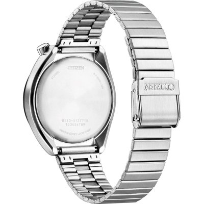 This Citizen watch has a case made of stainless steel with a diameter of 38 mm and is fitted with a stainless steel band. Inside the case lies a Miyota movement and the watch features a Mineral crystal.