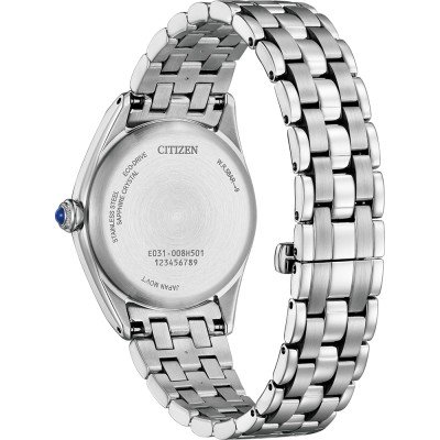 This Citizen watch has a case made of stainless steel with a diameter of 33 mm and is fitted with a stainless steel band. Inside the case lies a Citizen movement and the watch features a Sapphire crystal.
