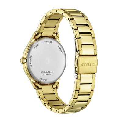This Citizen watch has a case made of stainless steel with a diameter of 33.5 mm and is fitted with a stainless steel band. Inside the case lies a Citizen movement and the watch features a Mineral crystal.
