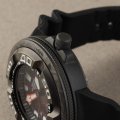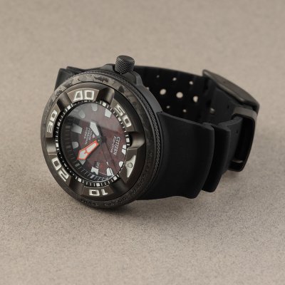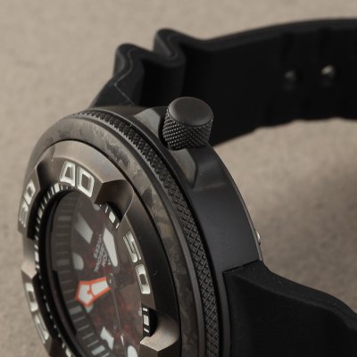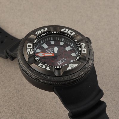 This Citizen watch has a case made of stainless steel with a diameter of 48 mm and is fitted with a rubber band. Inside the case lies a Citizen movement and the watch features a Hardened mineral crystal.