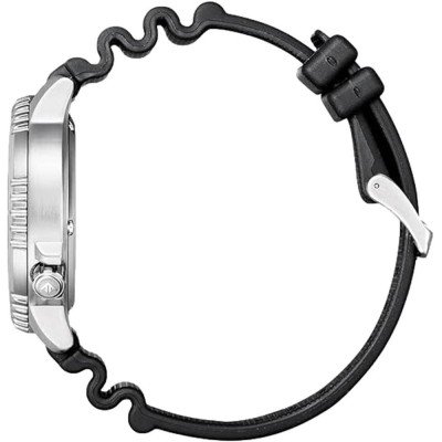 This Citizen watch has a case made of stainless steel with a diameter of 44 mm and is fitted with a rubber band. Inside the case lies a Citizen movement and the watch features a Mineral crystal.