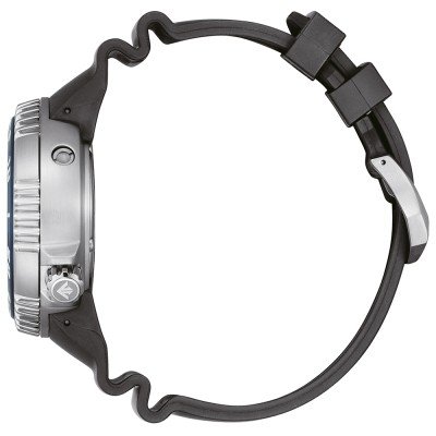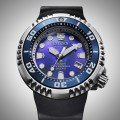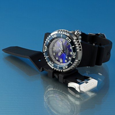 This Promaster watch brings everything you may expect from a Citizen diving watch. It was released as a Limited to 4800 Edition and features an eco-friendly Benebiol – biomass based plastic – diving strap with characteristic extending wave structure. The Cal. E365 Eco-Drive movement has an accuracy of ±15 seconds per month and runs for up to one year on a full charge. The watch is ISO-certified for a standard water resistance to 30 atm (saturation diving).