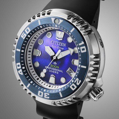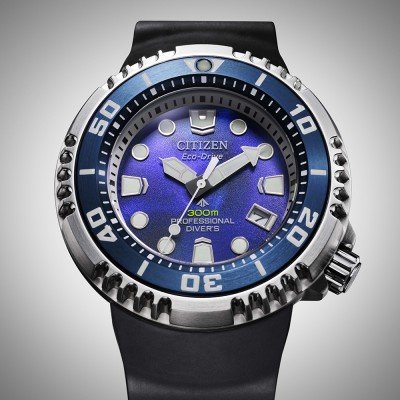 This watch with an intense blue dial is part of the Citizen ‘Unite in blue’ Limited Edition series with the motto “Sea of silence”. A revolutionary pigment-free ink on the dial uses micro-structured surfaces to transform the incoming light into a multifaceted spectrum of blue hues to express the ever changing moods of the sea of this eco-friendly series of watches. All the individual components of the dials are made from recycled materials. All watches in this collection are of course powered by the cleanest form of energy: light – both from the sun and artificial sources - housing Citizen’s proprietary Eco-Drive solar technology. A first in the watch industry and certified as an Eco Mark product by the Japan Environment Association (JEA)and recognized for its contribution to ecological sustainability.