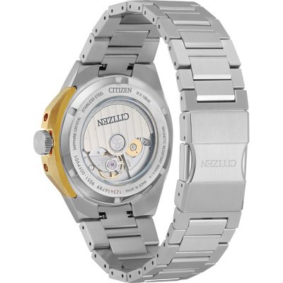 This Citizen watch has a case made of stainless steel with a diameter of 40 mm and is fitted with a stainless steel band. Inside the case lies a Citizen movement and the watch features a Single anti-reflective sapphire crystal.