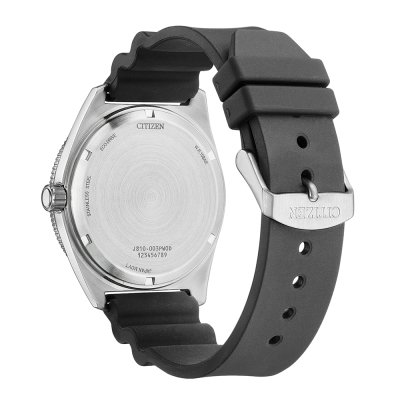 This Citizen watch has a case made of stainless steel with a diameter of 43 mm and is fitted with a rubber band. Inside the case lies a Citizen movement and the watch features a Mineral crystal.