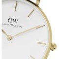 This Daniel Wellington watch has a case made of stainless steel with a diameter of 32 mm and is fitted with a stainless steel band. Inside the case lies a Miyota movement and the watch features a Mineral crystal.
