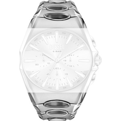 This Diesel watch strap is made of stainless steel and is attached to the watch by means of quick release pushpins. The band has a width of 30 mm and is closed by means of a deployment clasp with push buttons. The strap has no straight mount which means that this strap is only suitable for the watches listed below.