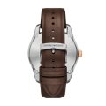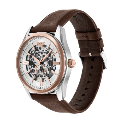 This Emporio Armani watch has a case made of stainless steel with a diameter of 43 mm and is fitted with a leather band. Inside the case lies a Miyota movement and the watch features a Mineral crystal.
