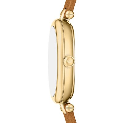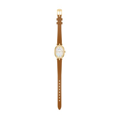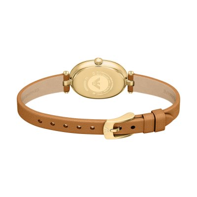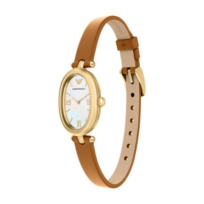 This Emporio Armani watch has a case made of stainless steel with a diameter of 28 mm and is fitted with a leather band. Inside the case lies a Seiko movement and the watch features a Mineral crystal.