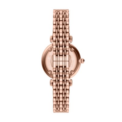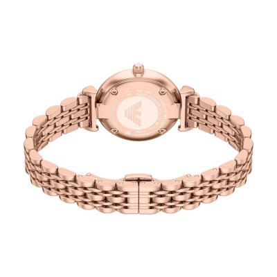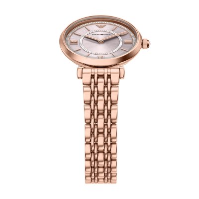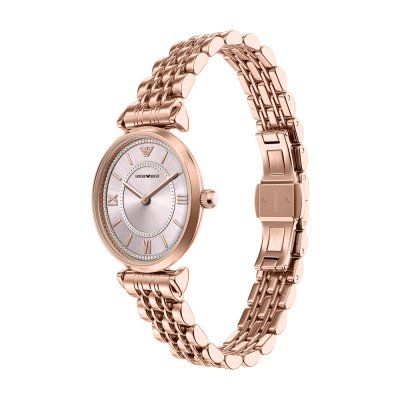 This Emporio Armani watch has a case made of stainless steel with a diameter of 32 mm and is fitted with a stainless steel band. Inside the case lies a Seiko Instruments Inc. movement and the watch features a Mineral crystal.