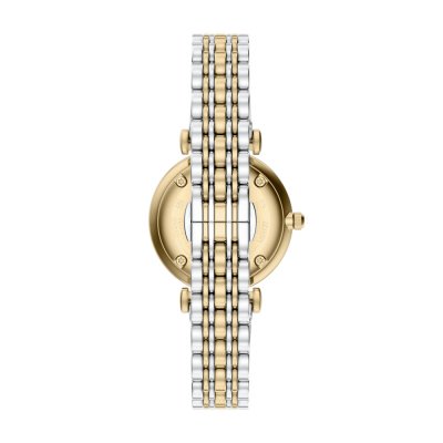 This Emporio Armani watch has a case made of stainless steel with a diameter of 32 mm and is fitted with a stainless steel band. Inside the case lies a Seiko Instruments Inc. movement and the watch features a Mineral crystal.