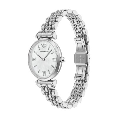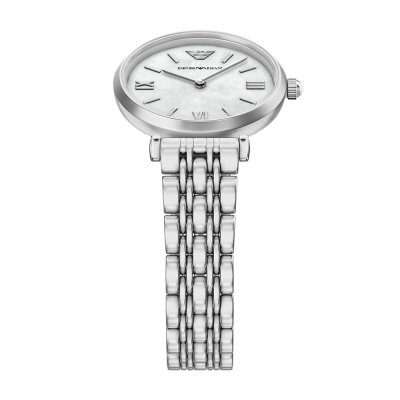 This Emporio Armani watch has a case made of stainless steel with a diameter of 28 mm and is fitted with a stainless steel band. Inside the case lies a Seiko Instruments Inc. movement and the watch features a Mineral crystal.